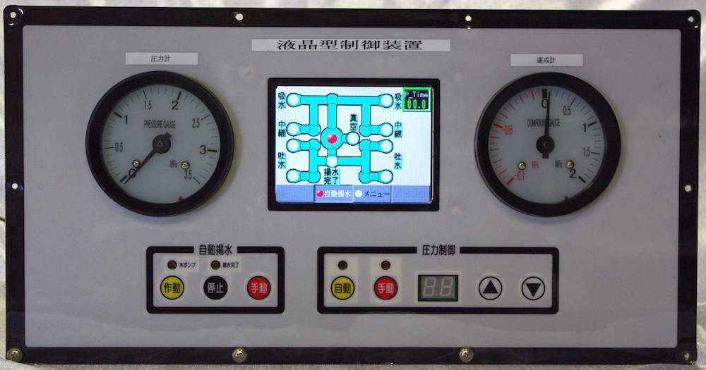 液晶ポンプモニタと電子式圧力・連成計のセットです。放水圧制御操作をスイッチ操作にしてあります。
